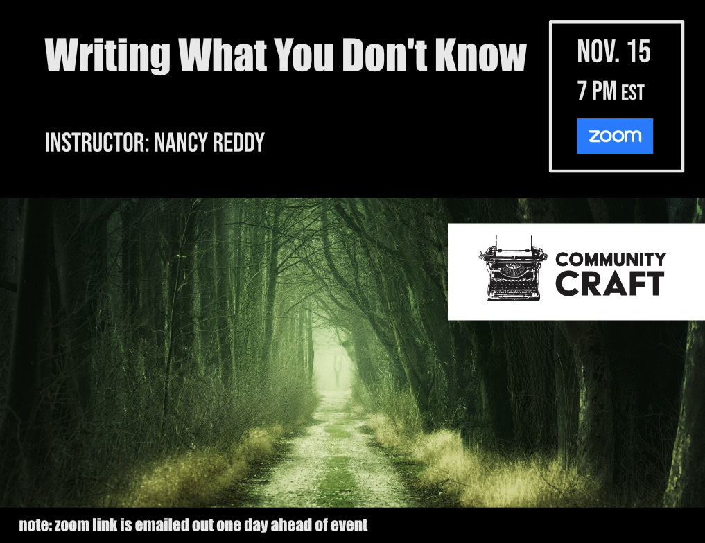 Writing What You Don’t Know (a Community Craft workshop), Tuesday, November 15, 7-8PM eastern