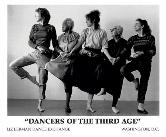 Things keep on changing as my kids move through the stages of their own growth. When my first daughter was a baby, I remember writing and squeezing in paid journalism work while she slept. Somehow I managed to write a manuscript of poetry during that time. With two kids, the equation got trickier, but my husband suggested I take one morning a week to go off and write by myself. I took to camping out at the local community center, in a lounge with secondhand furniture and intermittent heat. Not a lot of hours per week, but so many more than zero—those mornings became the anchor of my writing life. In the bathroom of that lounge was this poster titled Dancers of the Third Age, and I thought of these dancers as my artmaking fairy godmothers.