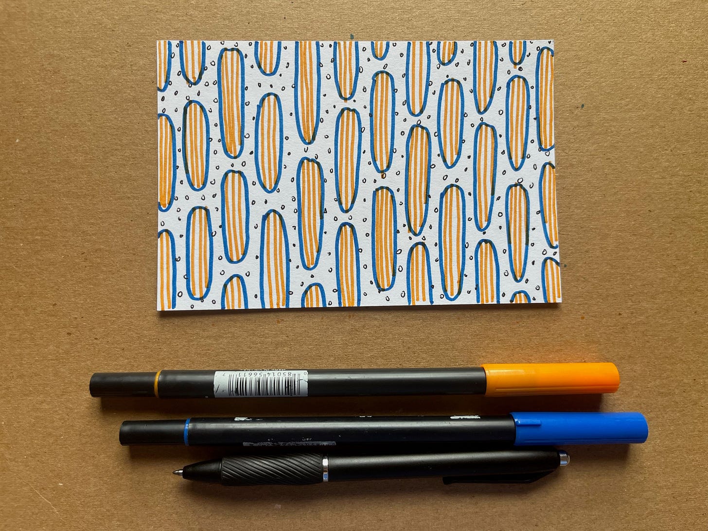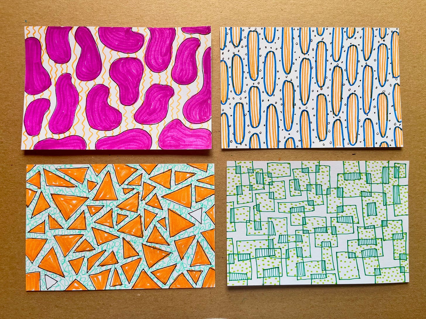 Change your pen again, or don’t. Now fill the background of the page, in between the shapes, with another pattern, until the whole page is filled.