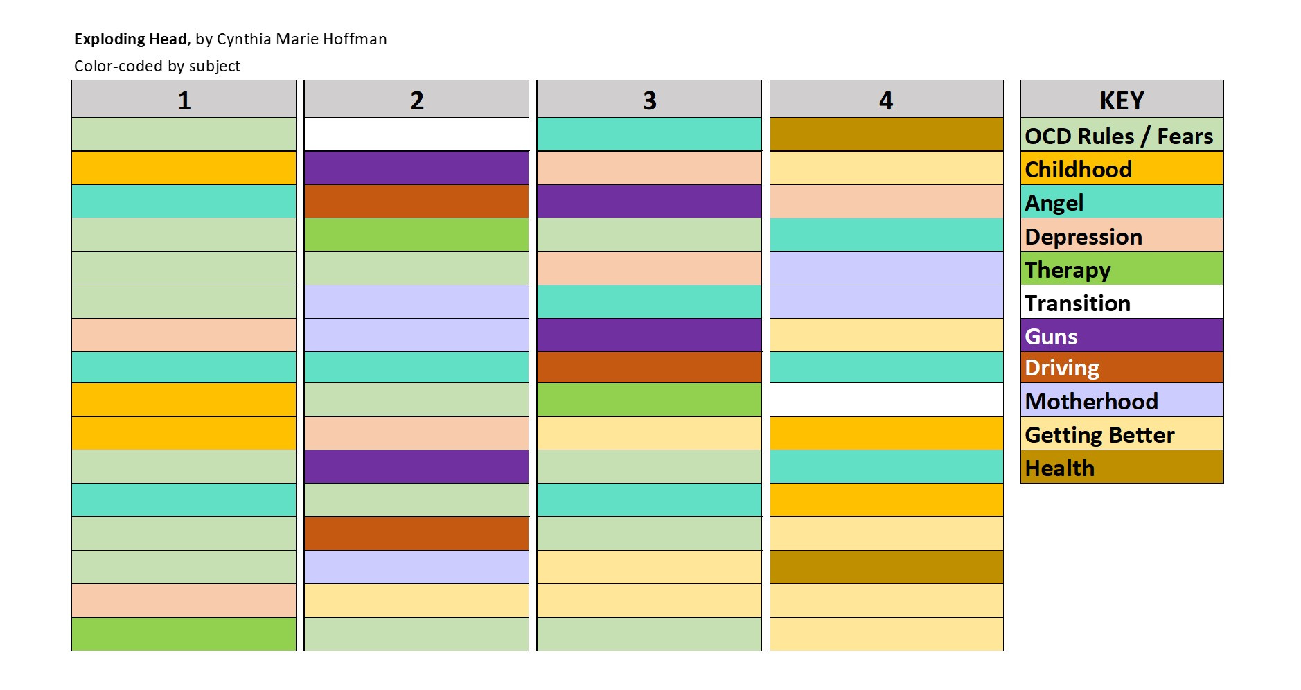 Then, I had to order the poems. For a long time, I struggled with the idea that the arc of this manuscript must be the story of how my OCD got better. So I looked for that arc in the themes of my OCD and in the categories on my spreadsheet. For example, if I put all the gun-themed poems together, could I find evidence that I progressively worried less about guns? The answer was no. Did I seem to rely less on counting compulsions? Nope – they’re still here! So what was the argument of this project? For a long time, I described it like this: “I have OCD, and I just want to tell people what it’s like.” But I knew that wasn’t enough. That’s not a book.