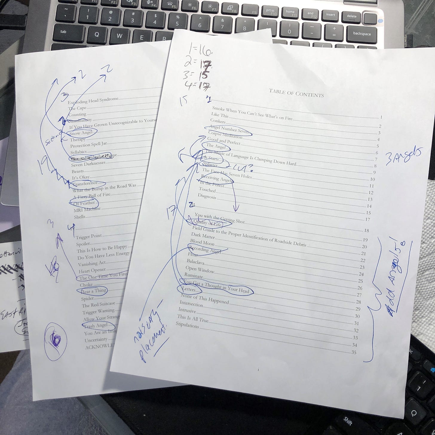 I listed the poems by subject in a spreadsheet (I love spreadsheets!). And that allowed me to immediately visualize that I had too many driving poems, not enough angels, and I’d pretty much beaten the subject of death to death. A single category with a long list of poems looks bulky in a spreadsheet, and it will feel equally heavy to the reader. I wasn’t aiming for an equal number of poems in each category, but the balance (or imbalance) of ideas should support the overall argument of the book. So at this point, I was looking at my lists and asking myself questions like, “Is worrying about car accidents so important that it justifies including twice as many poems than those about guns?” I made cuts, combined poems, and generated new work accordingly, checking my spreadsheet frequently.