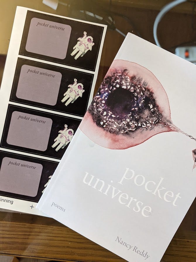 My new book, Pocket Universe, is officially out in the world! If you can sneak away for half an hour or so of your week day, I'd love for you to join me this Thursday afternoon at 3pm eastern for a live virtual event sponsored by LSU. I'll read a couple poems, talk about how I wrote the book (big chunks of it scribbled in a notebook in the parking lot at daycare!), and maybe play a little snippet of the Doctor Who episode that inspired the title. You can find the info here.